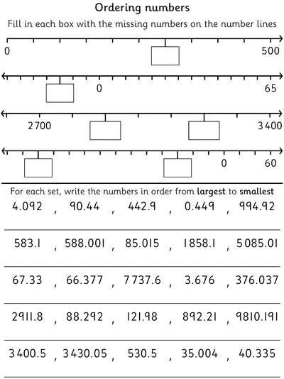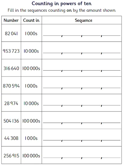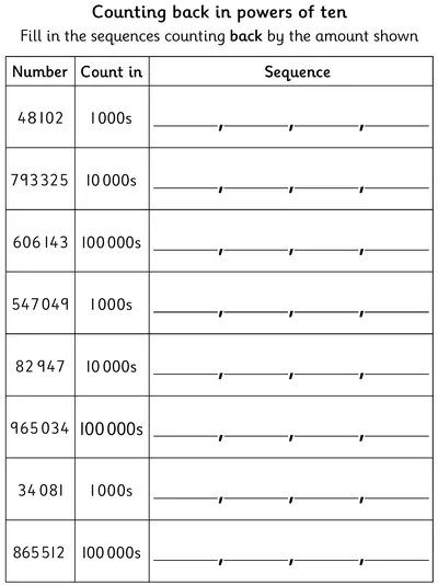 These counting worksheets build number fluency through sequencing in thousands to hundred-thousands, rounding whole and decimal numbers to two decimal places, and ordering values. Learners solve word problems with positive and negative numbers, subtract and compare negative values, and practise counting forwards and backwards in large steps with confidence.