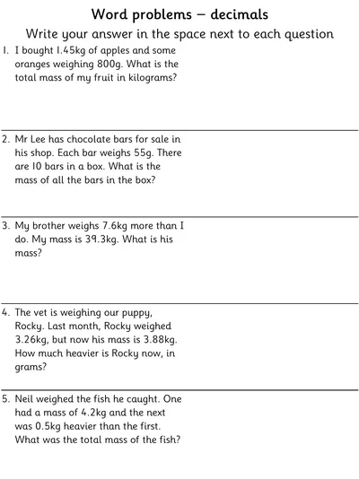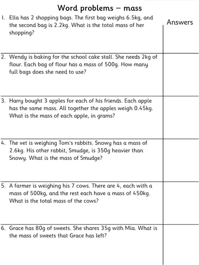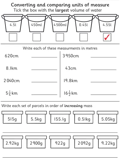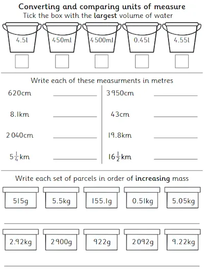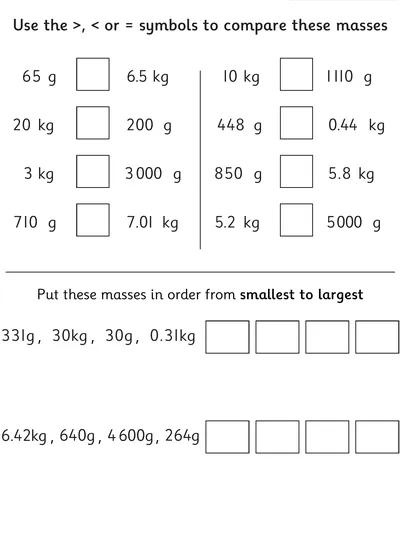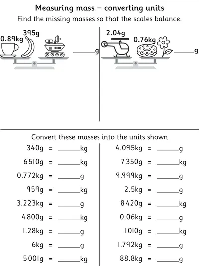 These measurement worksheets build practical maths skills through real-world word problems involving decimal masses, volume, length, capacity, and time. Learners practise converting between metric units, reading scales accurately, and comparing and ordering masses. Activities support fluency in interpreting measurements,