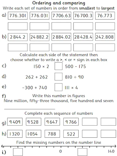 These ordering worksheets help learners build confidence in number sense and place value through a variety of tasks. These include comparing and ordering numbers up to six digits, decimals and negative numbers, and recognising patterns in number sequences. Learners also practise completing sequences both forwards and backwards, reinforcing logical thinking.