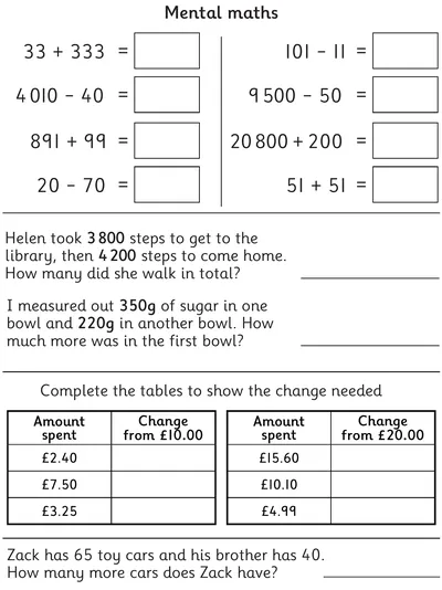 These subtraction worksheets support learners in developing written and mental strategies for solving problems with large numbers. Activities include column subtraction with two 6-digit numbers, two-step word problems, and calculations using rounding to the nearest 1000. Learners also practise mental addition and subtraction to build fluency and confidence.