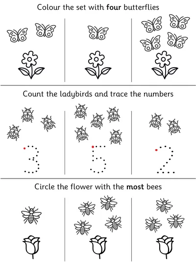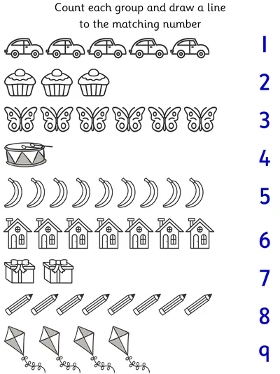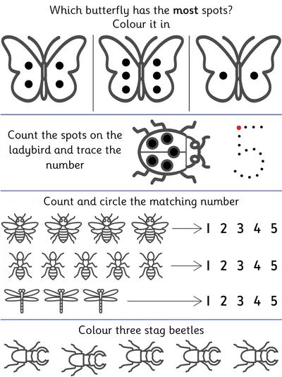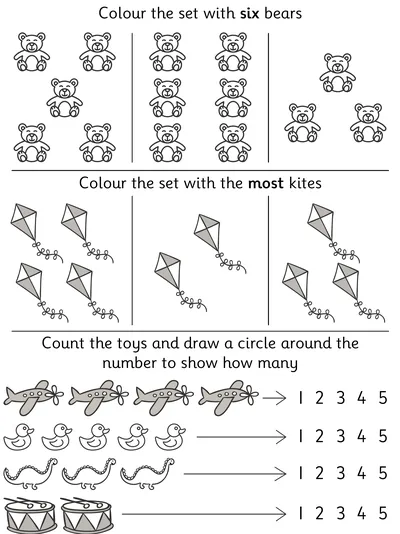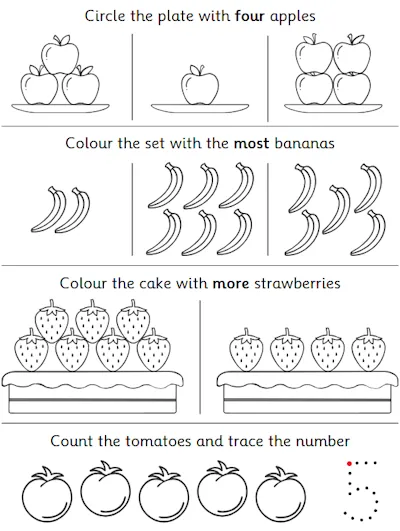 These worksheets help children develop essential number sense through early counting, number formation practise and matching and comparing numbers. They’ll also strengthen one-to-one correspondence skills, learning to match objects to numbers with confidence.