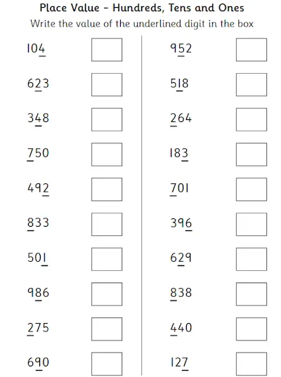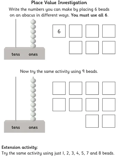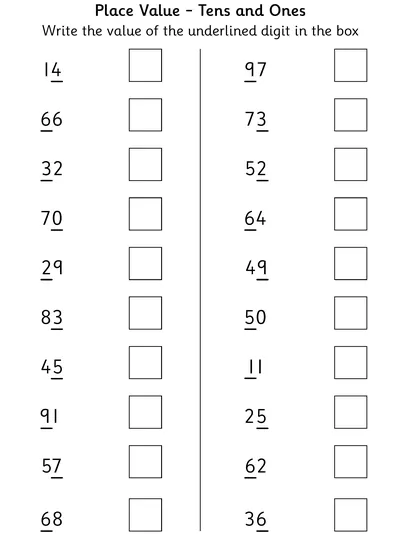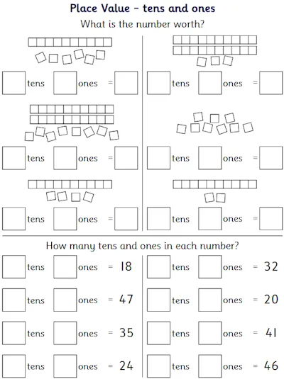These worksheets help children understand the value of digits in two- and three-digit numbers. Activities include recognising numbers represented by tens and ones representations and exploring place value through investigations, building a strong foundation for addition, subtraction, and number sense.