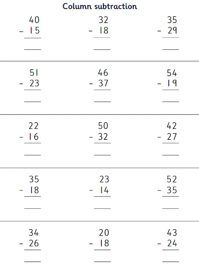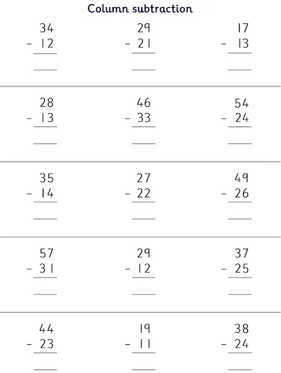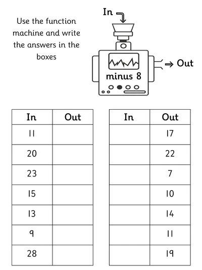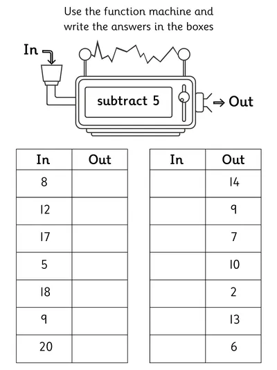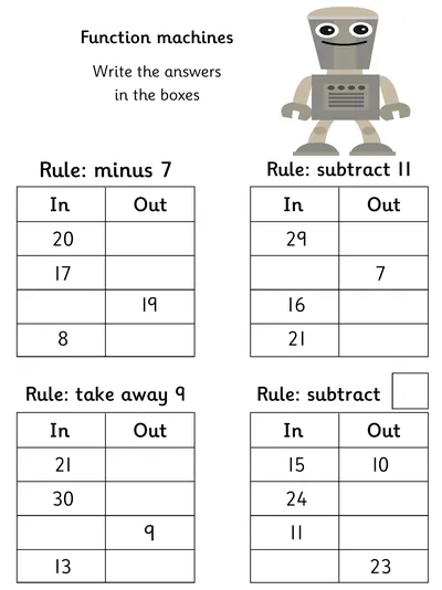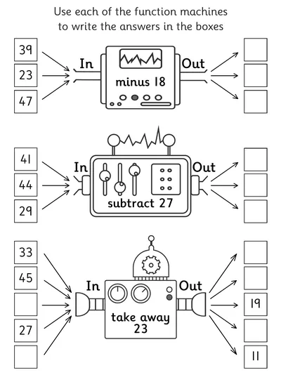 Explore Year 2 subtraction worksheets designed to build confidence and fluency. Children practise column subtraction with up to 2 two-digit numbers, solve missing signs, work through subtraction function machines, and complete number fact families within 100 using addition and subtraction skills in a fun, structured way.