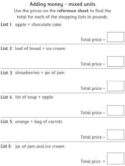 Discover printable UK money worksheets that support learning to count coins and notes, make amounts in different ways, calculate change from up to £5, and add prices from shopping lists. These activities help children develop practical money skills and apply addition and subtraction in everyday contexts.