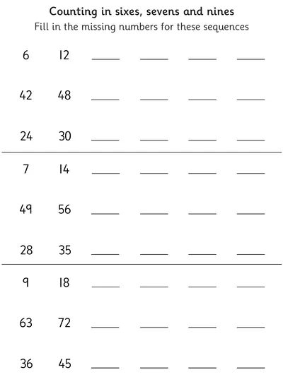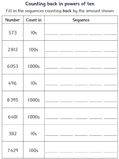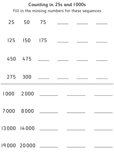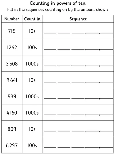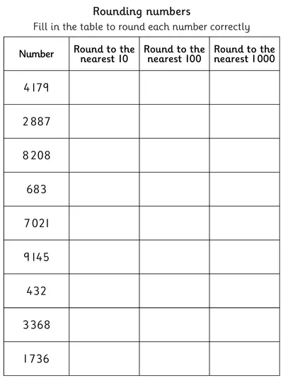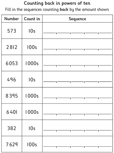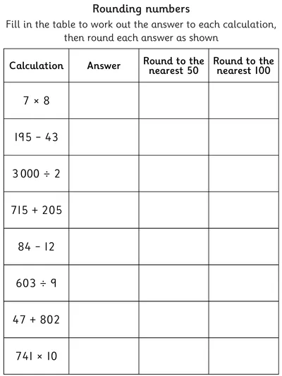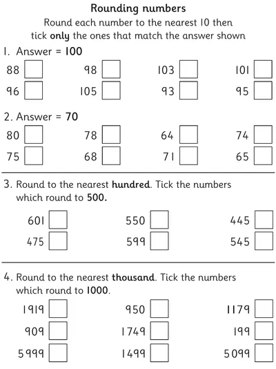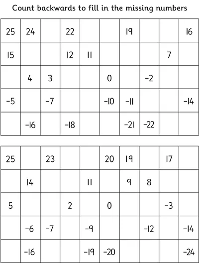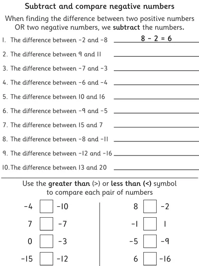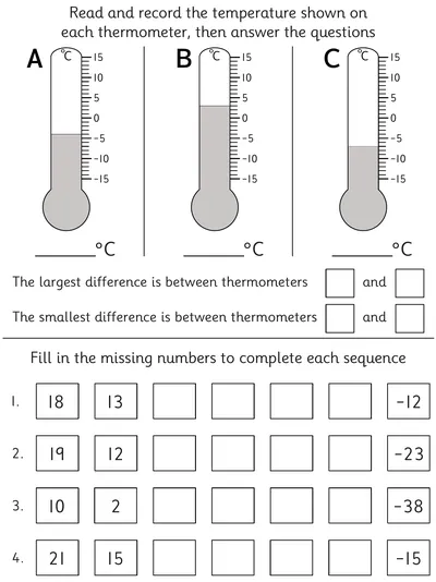 These worksheets support number fluency through counting positive and negative numbers, exploring multiples of 6, 7, 9, 10, 25, 50, 100 and 1000, and rounding to the nearest ten, hundred or thousand. Interpret negative temperatures and practise subtraction involving negative numbers.