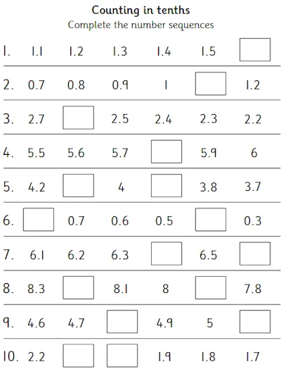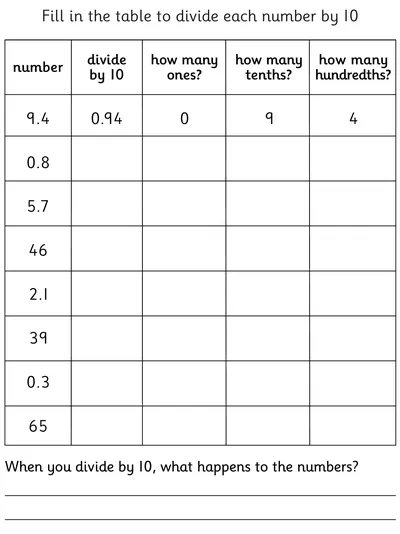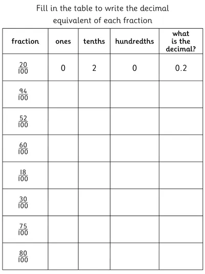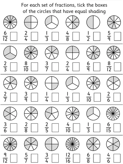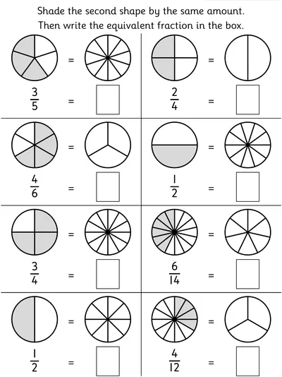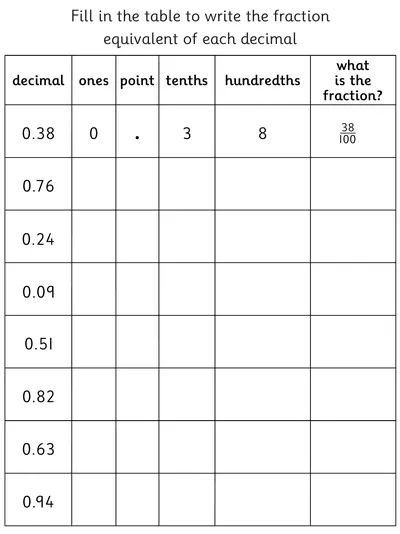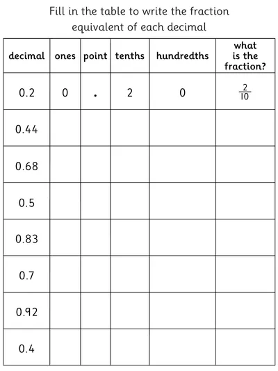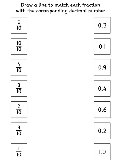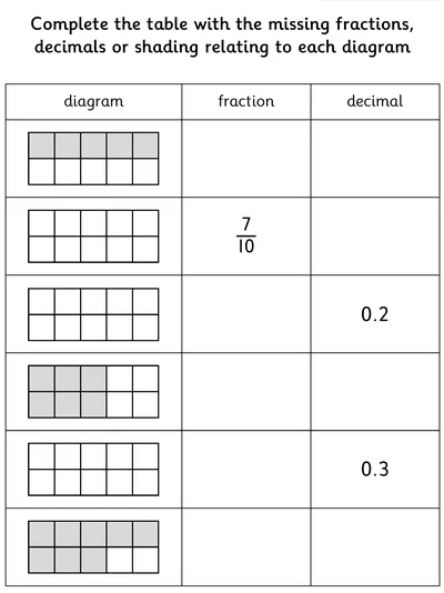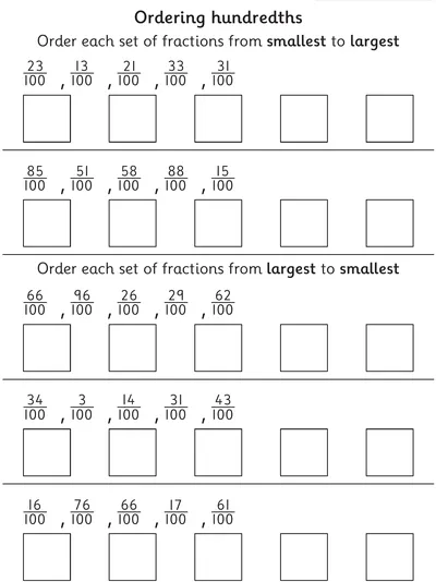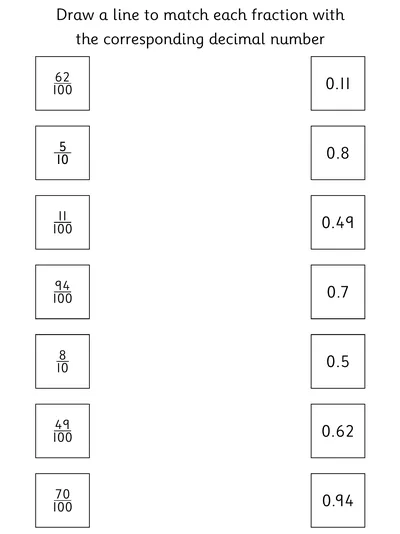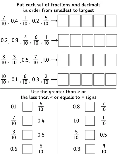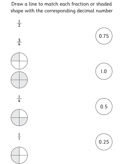 These fractions and decimals worksheets include activities for recognising unit and non-unit fractions of shapes, finding fractions of quantities, and ordering and comparing fractions. Learners explore fraction equivalents, match fractions to decimals, solve word problems involving decimals, and practise dividing whole and decimal numbers by 10 and 100.