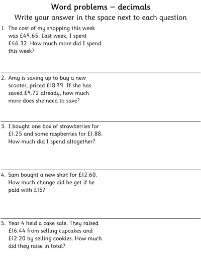 These UK money worksheets help children work with shopping lists containing mixed units, calculate change from amounts up to £10, and solve word problems involving decimal notation. Activities support understanding of pounds and pence, encourage practical application of addition and subtraction, and build confidence in handling money in everyday situations.
