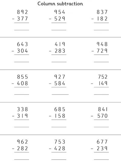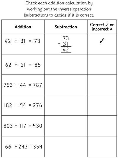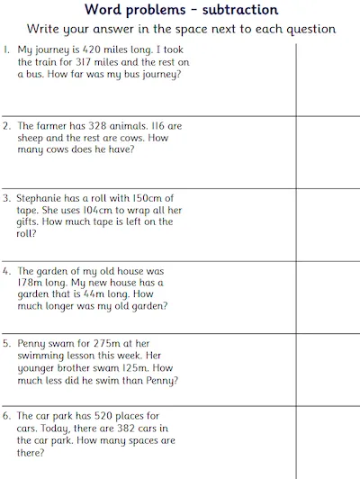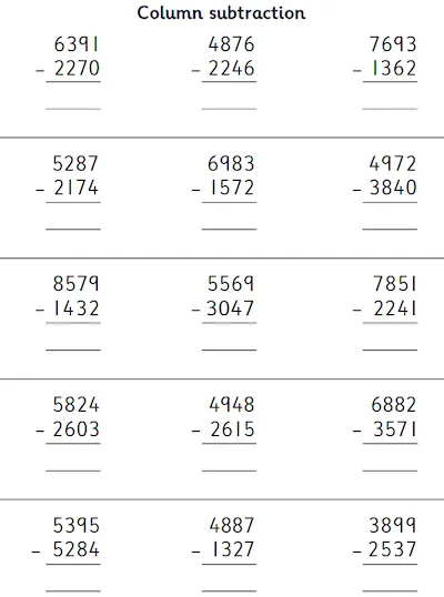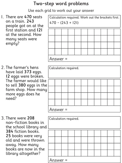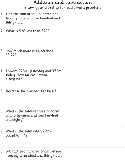 These subtraction worksheets focus on numbers up to four digits and include word problems, calculations involving decomposition, and using subtraction as an inverse operation to check addition. Activities help children strengthen their understanding of place value and help to develop efficient strategies.