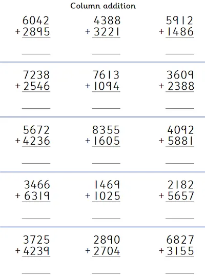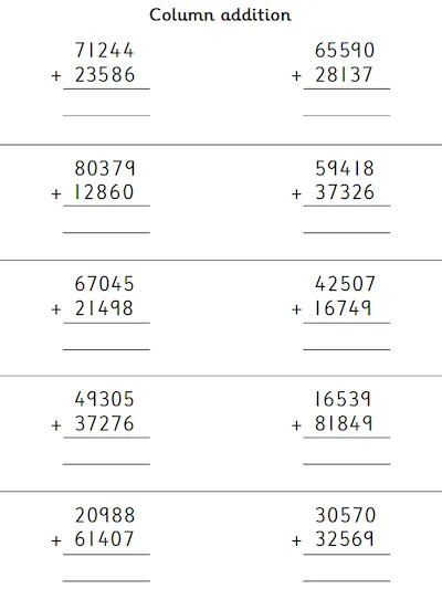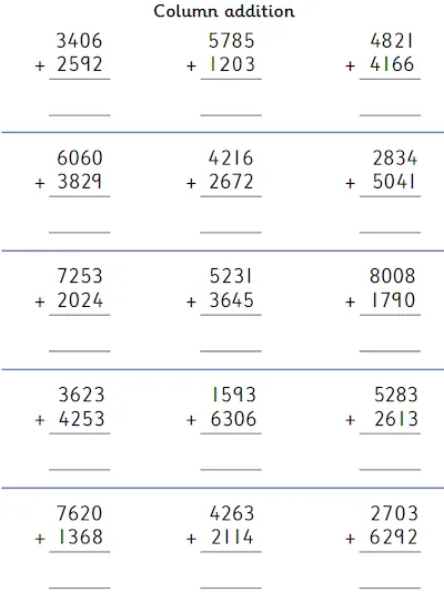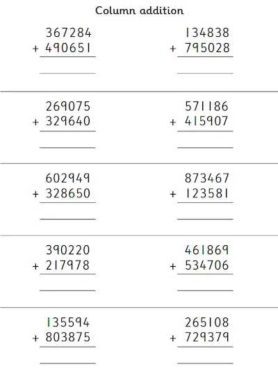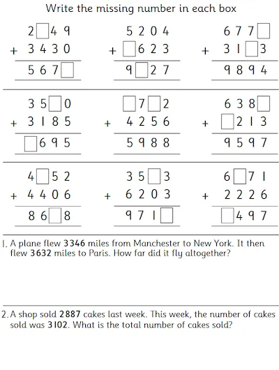 These addition worksheets build fluency and confidence with written methods. Learners practise column and horizontal addition with numbers up to six digits, solve missing number problems, and tackle two-step word problems that require reasoning. Activities also include adding decimal numbers.